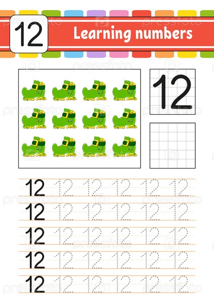 Обведи и напиши цифры. Практика письма. Изучение цифр для детей. Развивающий рабочий лист. Страница с заданиями. Векторная иллюстрация