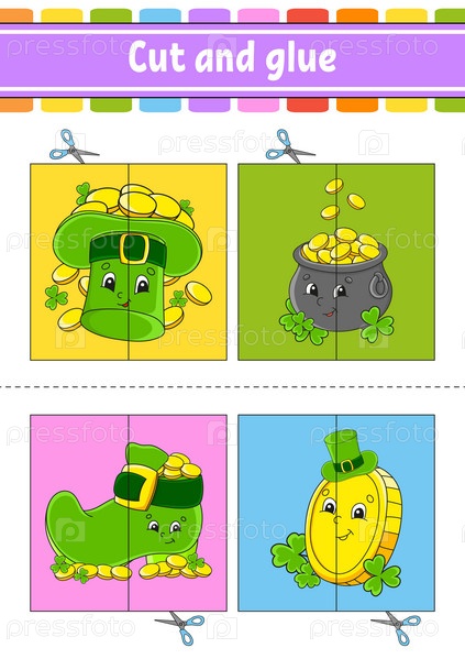 Разрезай и играй. Бумажная игра с клеем. Флэш-карточки. Рабочий лист для обучения. Страница с заданиями. Забавный персонаж. Мультяшный стиль. Векторная иллюстрация