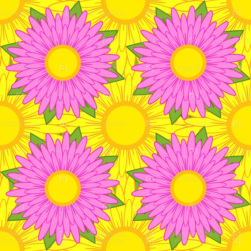 Бесшовный узор из розовых цветов с зелеными листьями на фоне желтых цветов