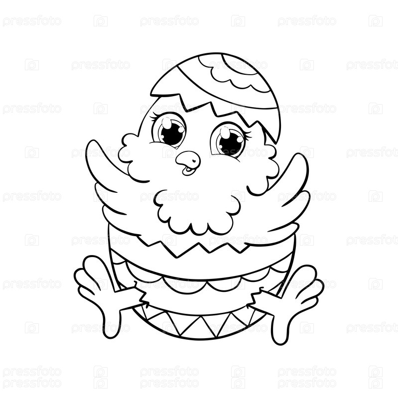 Милый цыпленок в пасхальном яйце. Страница раскраски для детей. Персонаж в мультяшном стиле. Векторная иллюстрация на белом фоне