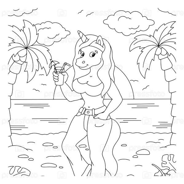 Единорог отдыхает на пляже. Страница раскраски для детей. Персонаж в мультяшном стиле. Векторная иллюстрация на белом фоне