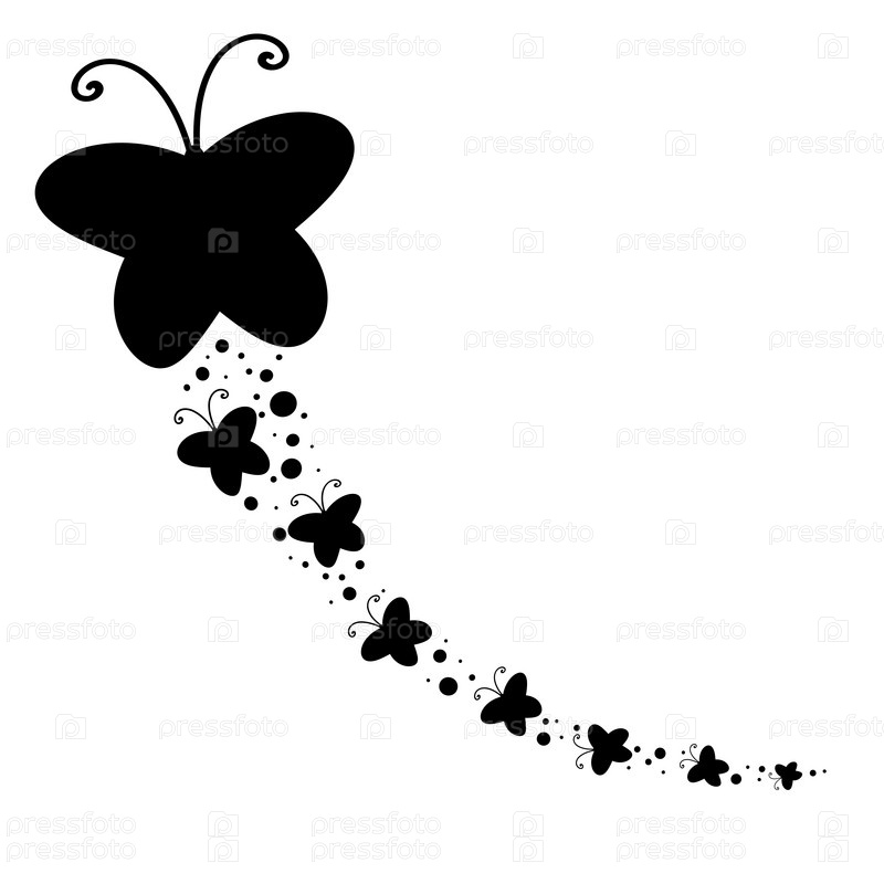 Черный силуэт большой бабочки и летящих за ней маленьких бабочек