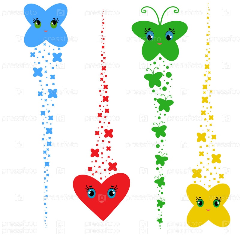 Набор цветных мультфильмов. Стая абстрактных плоских бабочек, сердечек, звездочек, летящих одна за другой