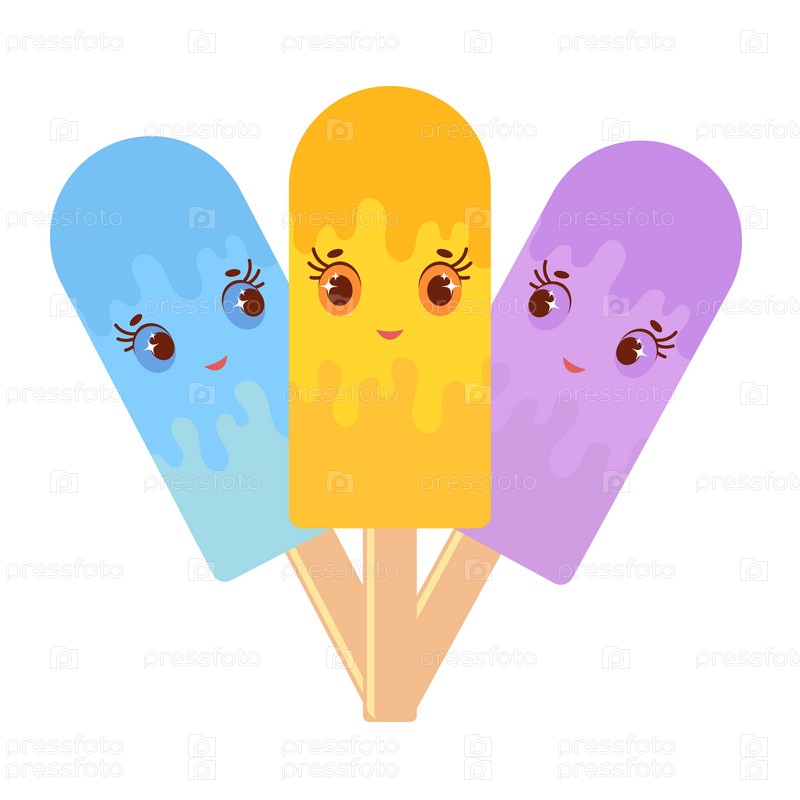 Набор плоского цветного изолированного мультяшного мороженого, политого глазурью синего, желтого, фиолетового цветов. На деревянных палочках. На белом фоне