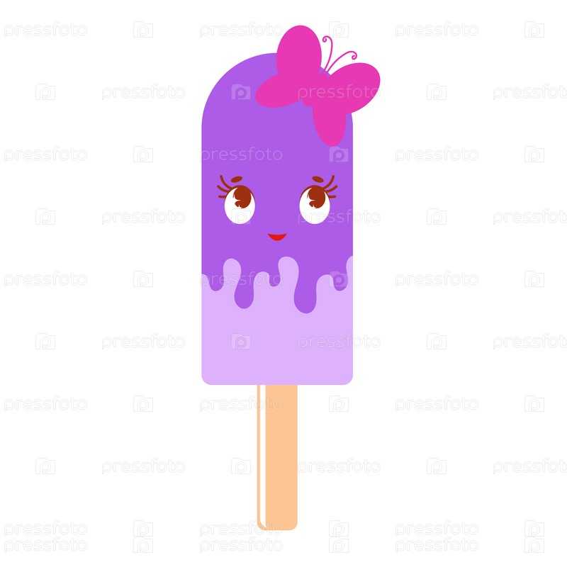 Фиолетовый мультяшный эскимо с розовой бабочкой. Плоский цветной рисунок на белом фоне