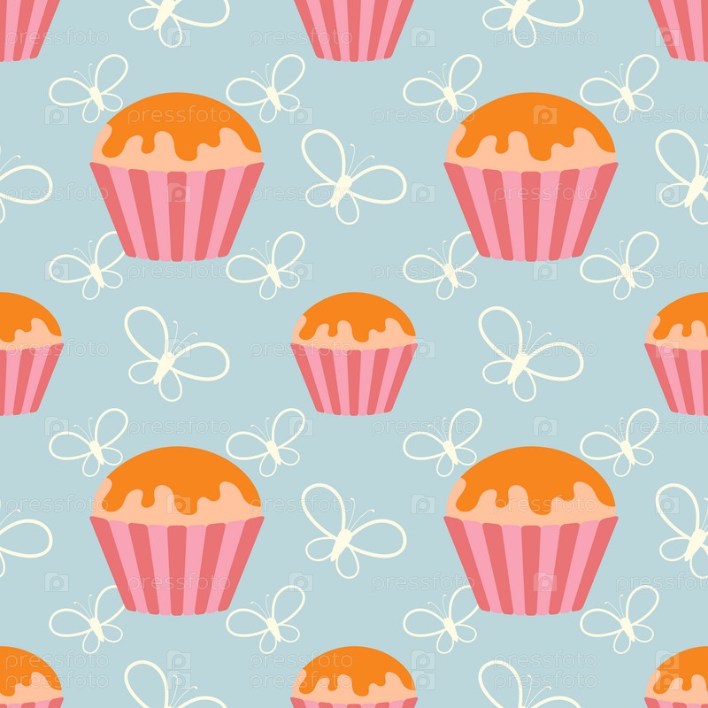 Цветной бесшовный узор вкусных кексов на синем фоне. Простая плоская векторная иллюстрация. Подходит для обоев, ткани, оберточной бумаги, чехлов