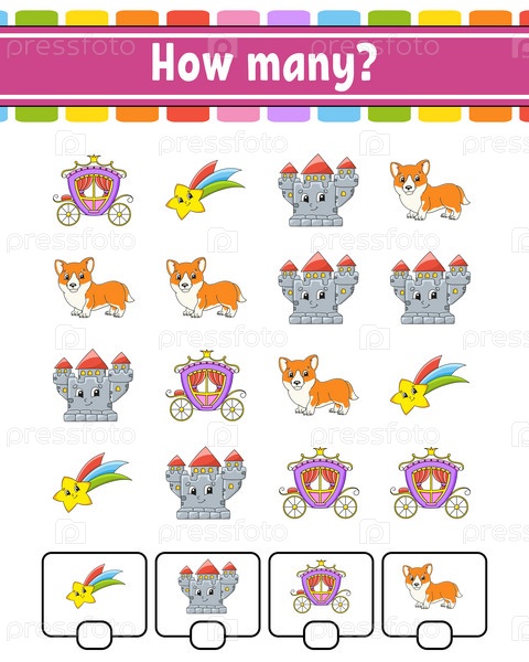 Игра-счет для детей. Счастливые персонажи. Изучение математики. Сколько предметов на картинке. Рабочий лист по образованию. С местом для ответов. Векторная иллюстрация