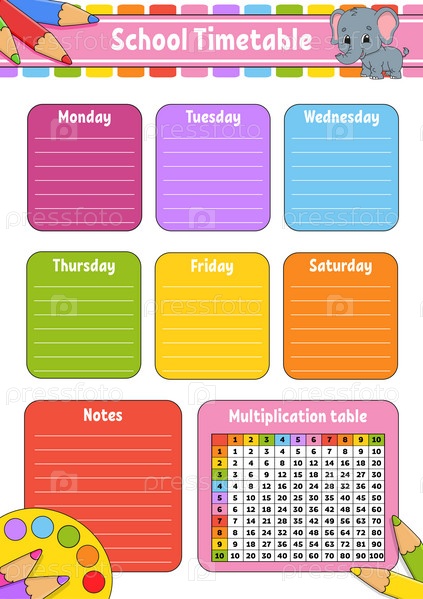 Расписание школы с таблицей умножения. Для образования детей. Изолировано на белом фоне. С милым персонажем мультфильма. Векторная иллюстрация