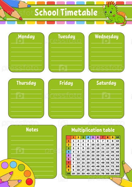 Расписание школы с таблицей умножения. Для образования детей. Изолировано на белом фоне. С милым персонажем мультфильма. Векторная иллюстрация