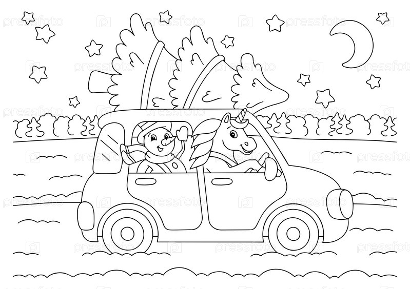 Снеговик и единорог едут в машине и везут рождественскую елку. Страница раскраски для детей. Персонаж в мультяшном стиле. Векторная иллюстрация на белом фоне