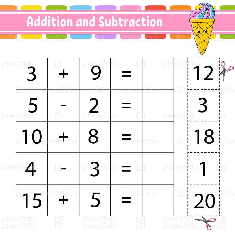 Сложение и вычитание. Задание для детей. Вырезать и вставить. Образовательный развивающий рабочий лист. Страница с заданиями. Игра для детей. Забавный персонаж. Изолированная векторная иллюстрация. Мультяшный стиль