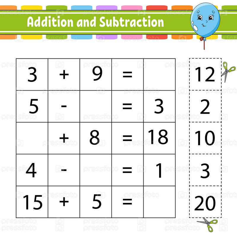Сложение и вычитание. Задание для детей. Вырезать и вставить. Образовательный развивающий рабочий лист. Страница с заданиями. Игра для детей. Забавный персонаж. Изолированная векторная иллюстрация. Мультяшный стиль