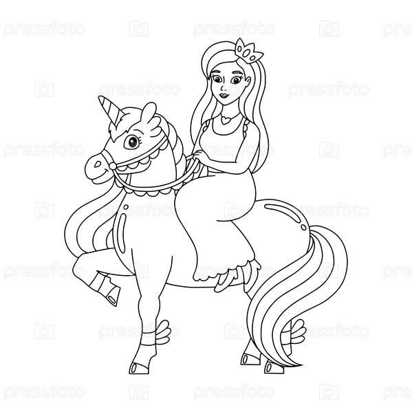 Принцесса едет на единороге. Раскраска для детей. Персонаж в мультяшном стиле. Векторная иллюстрация на белом фоне