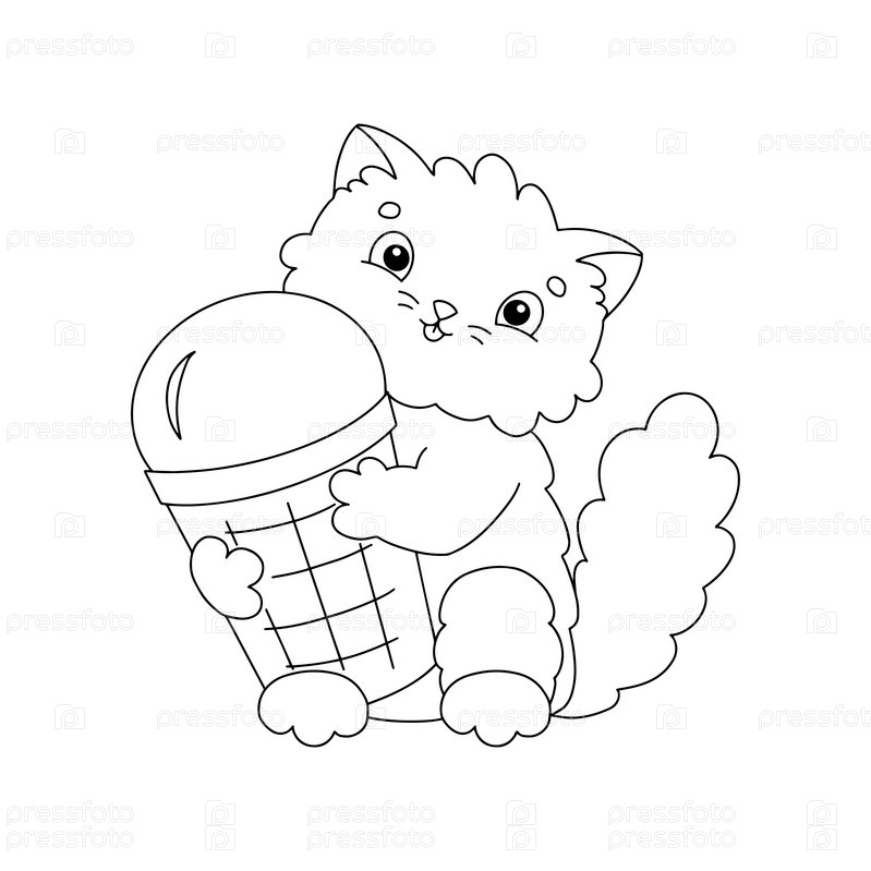 Милый пушистый кот держит в лапках вкусное аппетитное мороженое. Раскраска для детей. Мультяшный стиль. Векторная иллюстрация на белом фоне