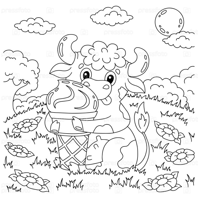 Корова на ферме держит мороженое. Страница раскраски для детей. Мультяшный стиль. Векторная иллюстрация на белом фоне