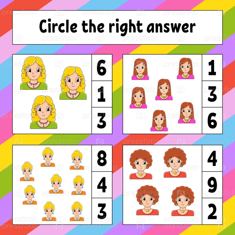 Обведи правильный ответ. Рабочий лист по развитию образования. Страница с заданиями с картинками. Игра для детей. Цветная изолированная векторная иллюстрация. Забавный персонаж. Мультяшный стиль