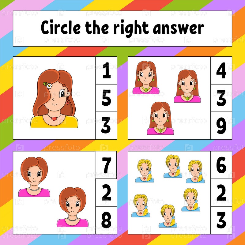 Обведи правильный ответ. Рабочий лист по развитию образования. Страница с заданиями с картинками. Игра для детей. Цветная изолированная векторная иллюстрация. Забавный персонаж. Мультяшный стиль