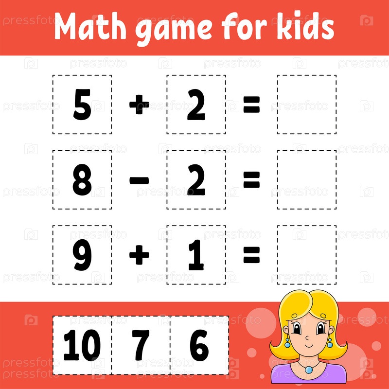 Математическая игра для детей. Образовательный развивающий рабочий лист. Страница с заданиями с картинками. Игра для детей. Цветная изолированная векторная иллюстрация. Забавный персонаж. Мультяшный стиль