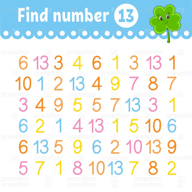 Найдите число. Образовательный развивающий рабочий лист. Страница с заданиями с картинками. Игра для детей. Цветная изолированная векторная иллюстрация. Забавный персонаж. Мультяшный стиль