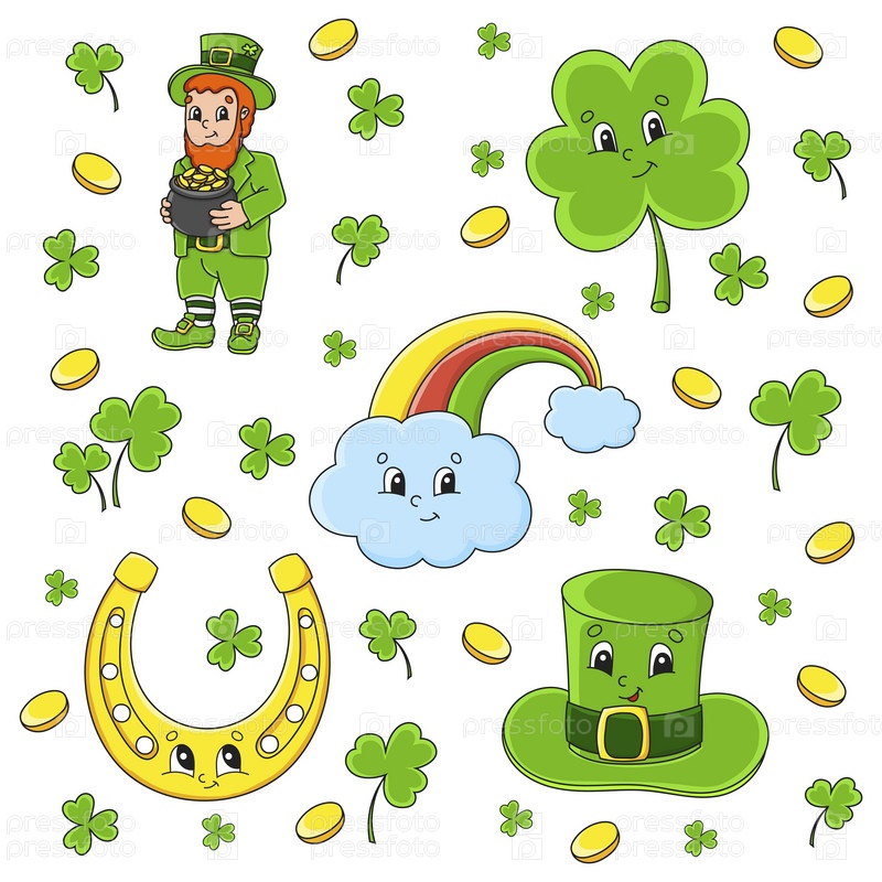 Набор наклеек с милыми мультяшными персонажами. День Святого Патрика. Нарисовано от руки. Красочная упаковка. Векторная иллюстрация. Коллекция нашивок для детей. Для ежедневника, органайзера, дневника