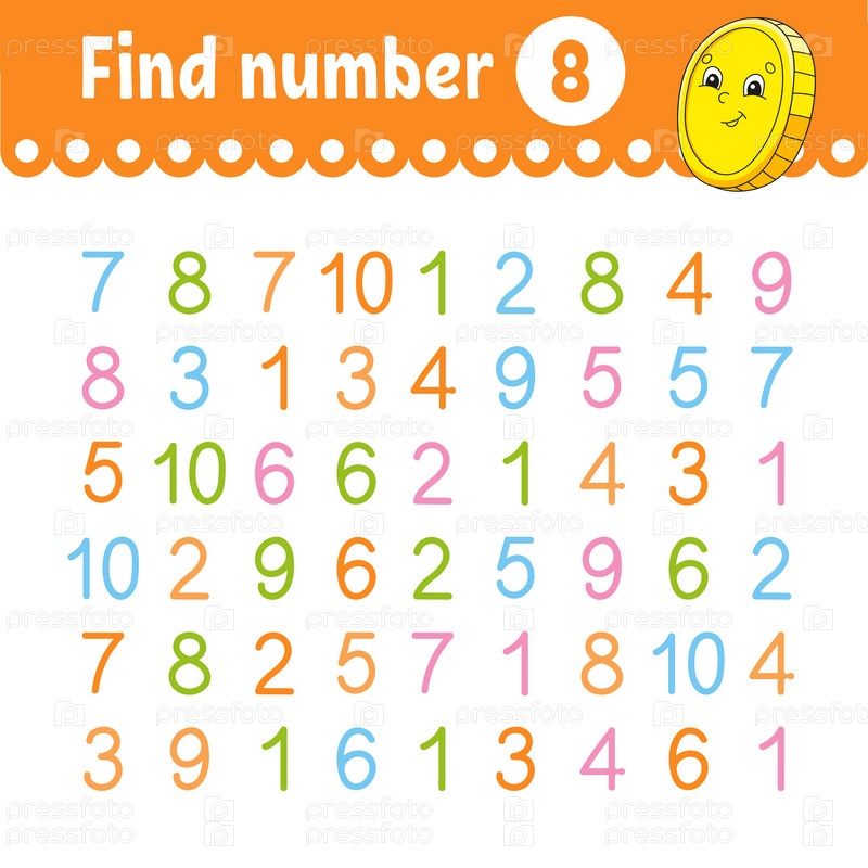 Найдите число. Образовательный развивающий рабочий лист. Страница с заданиями с картинками. Игра для детей. Цветная изолированная векторная иллюстрация. Забавный персонаж. Мультяшный стиль