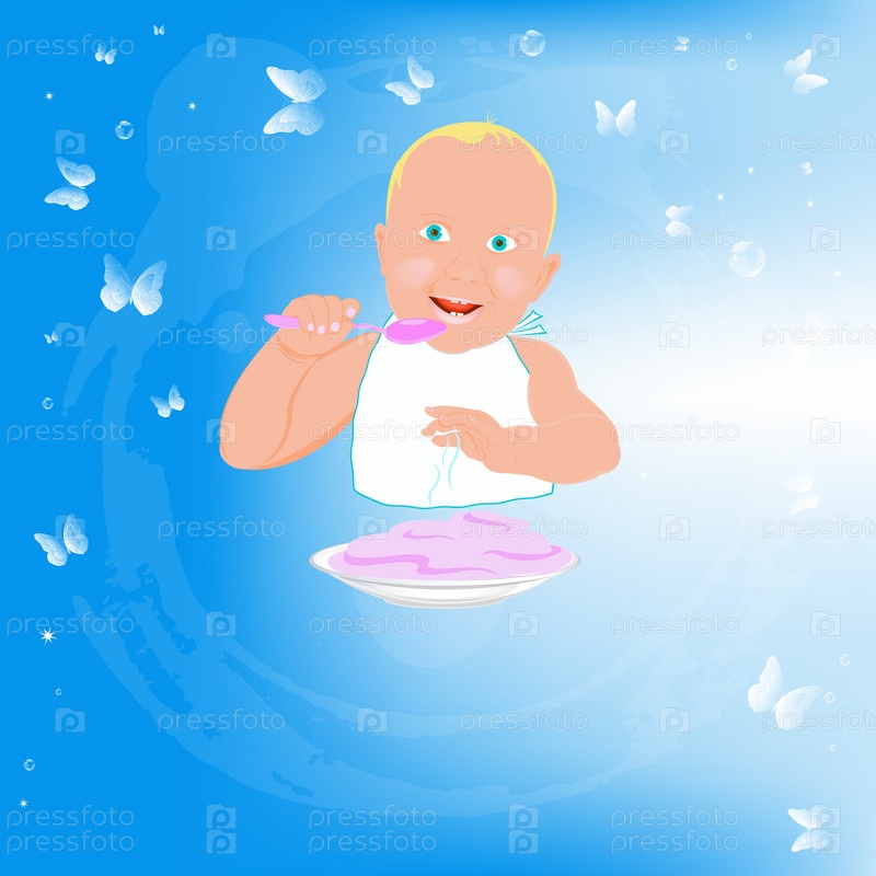 Малыш с ложкой и тарелка с фруктовой кашей на абстрактном голубом фоне. Здоровое детское питание. Этикетка