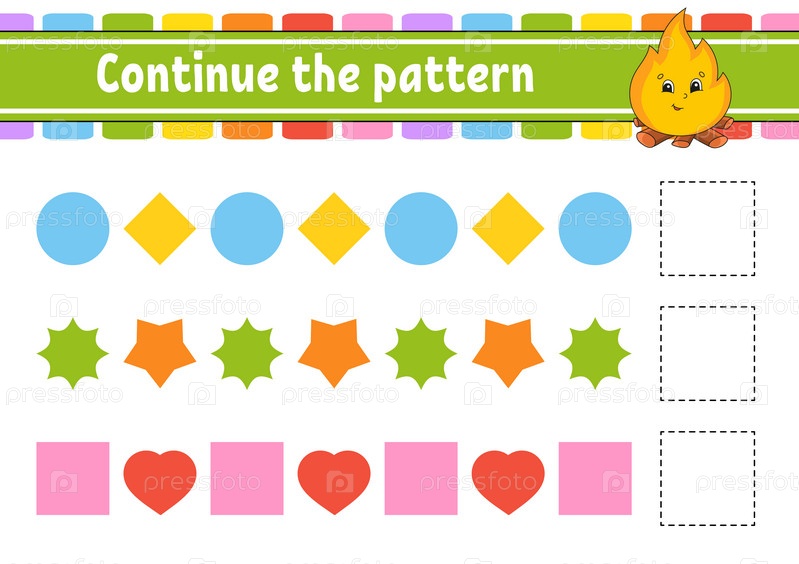 Продолжите узор. Развивающий рабочий лист для обучения. Игра для детей. Страница с заданиями. Головоломка для детей. Загадка для дошкольников. Милый мультяшный стиль. Векторная иллюстрация