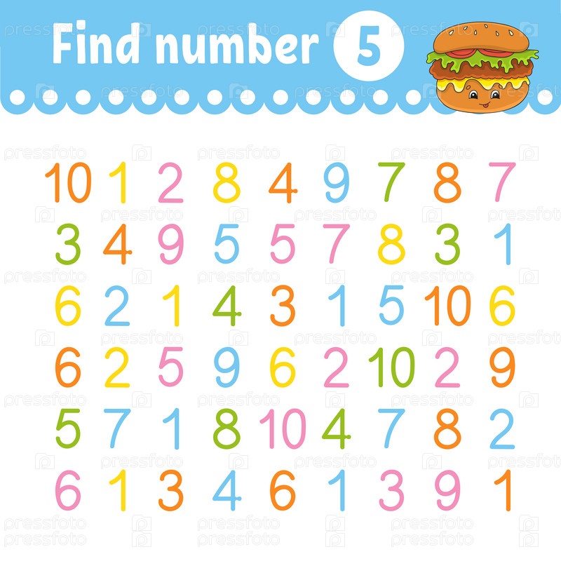 Найдите число. Образовательный развивающий рабочий лист. Страница с заданиями с картинками. Игра для детей. Забавный персонаж. Мультяшный стиль. Векторная иллюстрация