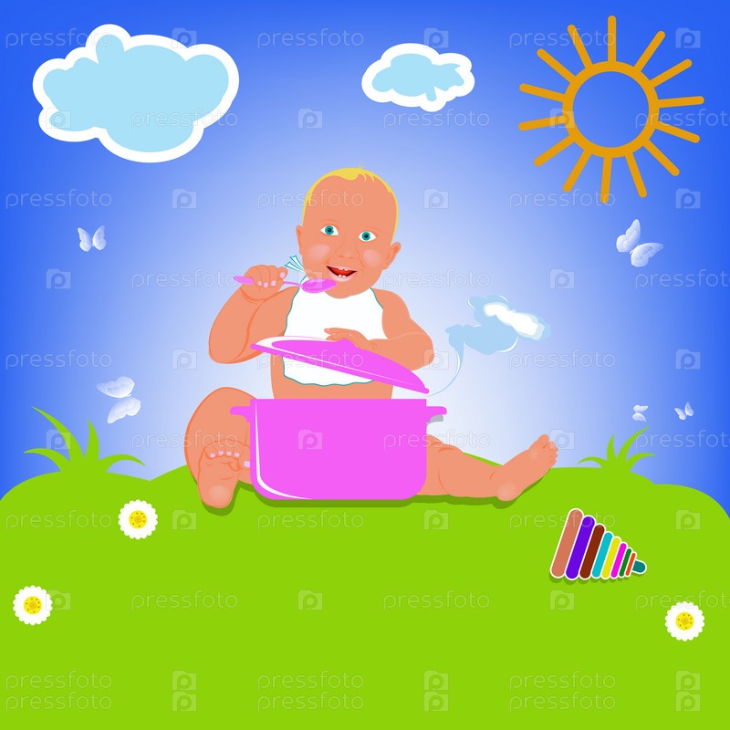 Малыш с ложкой и кастрюлей на белом фоне. Здоровое детское питание