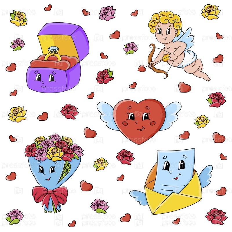 Набор милых мультяшных персонажей. Клипарт ко Дню святого Валентина. Нарисованный от руки. Красочный пакет. Векторная иллюстрация. Коллекция нашивок. Элементы дизайна этикеток. Для ежедневника, дневника, органайзера