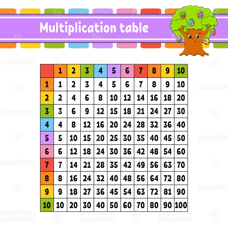 Цветной квадрат таблицы умножения от 1 до 100. Для обучения детей. Изолирован на белом фоне. С милым мультяшным персонажем