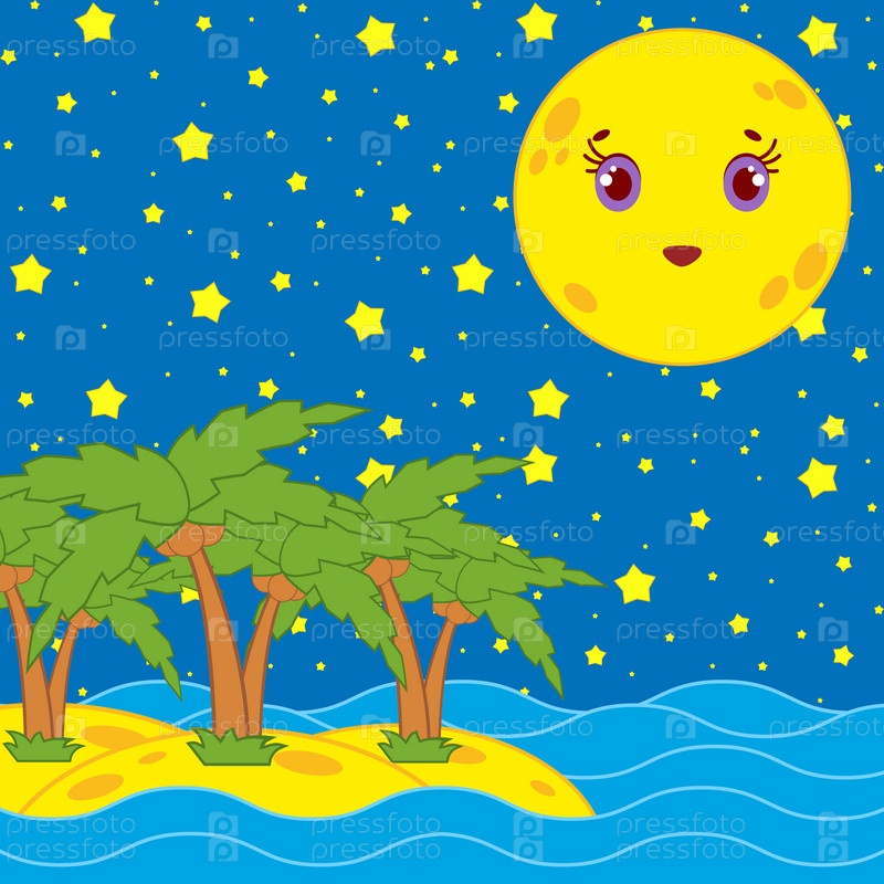 Желтая луна с улыбкой на фоне ночного неба и пальм на желтом песке на море