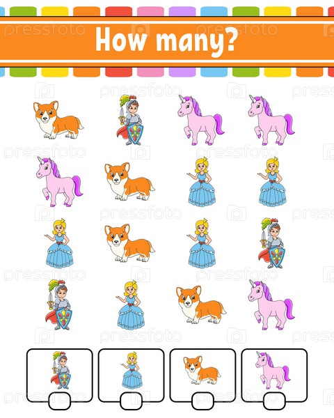 Игра-счет для детей. Счастливые персонажи. Изучение математики. Сколько предметов на картинке. Рабочий лист по образованию. С местом для ответов. Векторная иллюстрация
