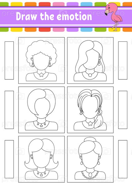 Нарисуй эмоцию. Рабочий лист заверши лицо. Раскраска для детей. Веселый персонаж. Векторная иллюстрация. Черный контурный силуэт. Векторная иллюстрация