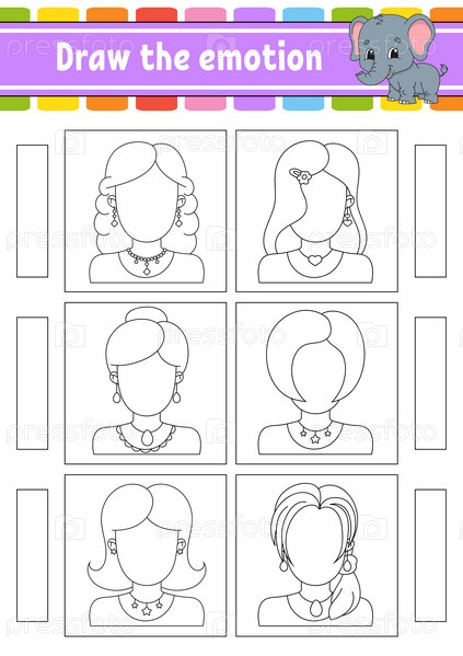 Нарисуй эмоцию. Рабочий лист заверши лицо. Раскраска для детей. Веселый персонаж. Векторная иллюстрация. Черный контурный силуэт. Векторная иллюстрация