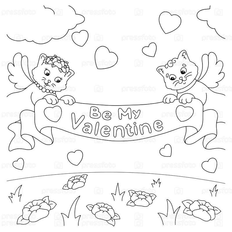 Пара кошек держит поздравительную ленту. Страница раскраски для детей. День святого Валентина. Персонаж в мультяшном стиле. Векторная иллюстрация на белом фоне
