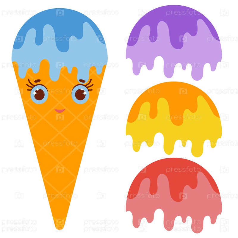 Набор шариков мороженого желтого, красного, фиолетового, синего цвета. Политые глазурью. Оранжевые мультяшные вафельные рожки с улыбками. Плоский цветной рисунок на белом фоне