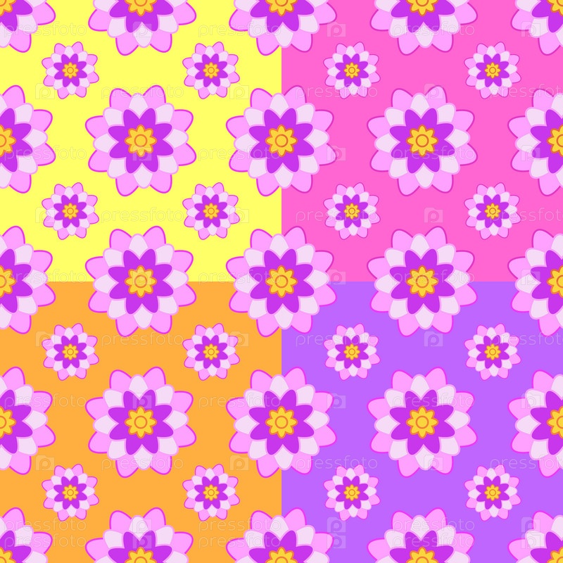 Набор бесшовных узоров из розовых цветов на желтом, розовом, оранжевом и фиолетовом фоне
