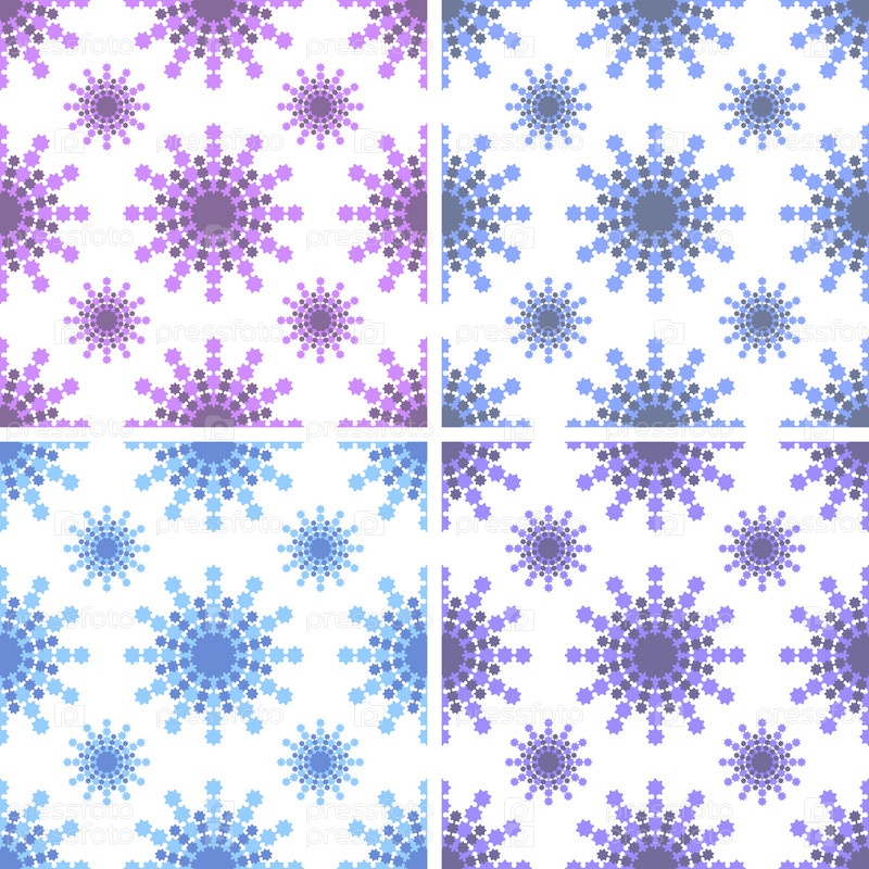 Набор бесшовных узоров из розовых, светло-голубых, синих, фиолетовых снежинок на белом фоне
