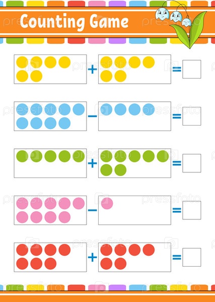 Сложение и вычитание. Задание для детей. Образовательный развивающий рабочий лист. Цветная страница активности. Игра для детей. Забавный персонаж. Изолированная векторная иллюстрация. Мультяшный стиль