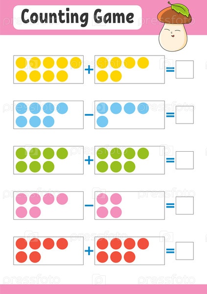 Сложение и вычитание. Задание для детей. Образовательный развивающий рабочий лист. Цветная страница активности. Игра для детей. Забавный персонаж. Изолированная векторная иллюстрация. Мультяшный стиль