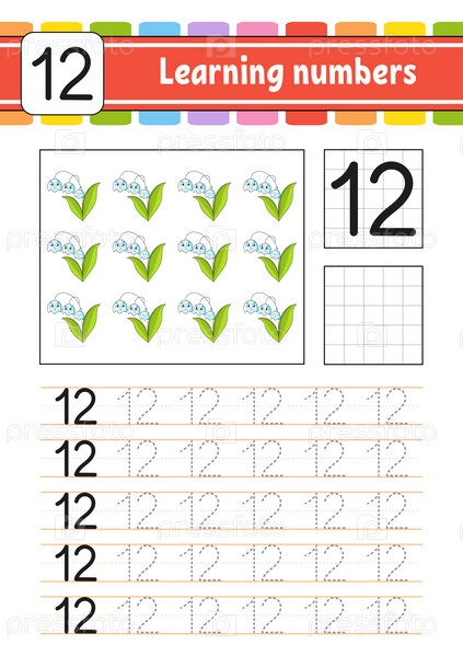 Обведи и напиши цифры. Практика письма. Изучение цифр для детей. Развивающий рабочий лист. Страница с заданиями. Векторная иллюстрация