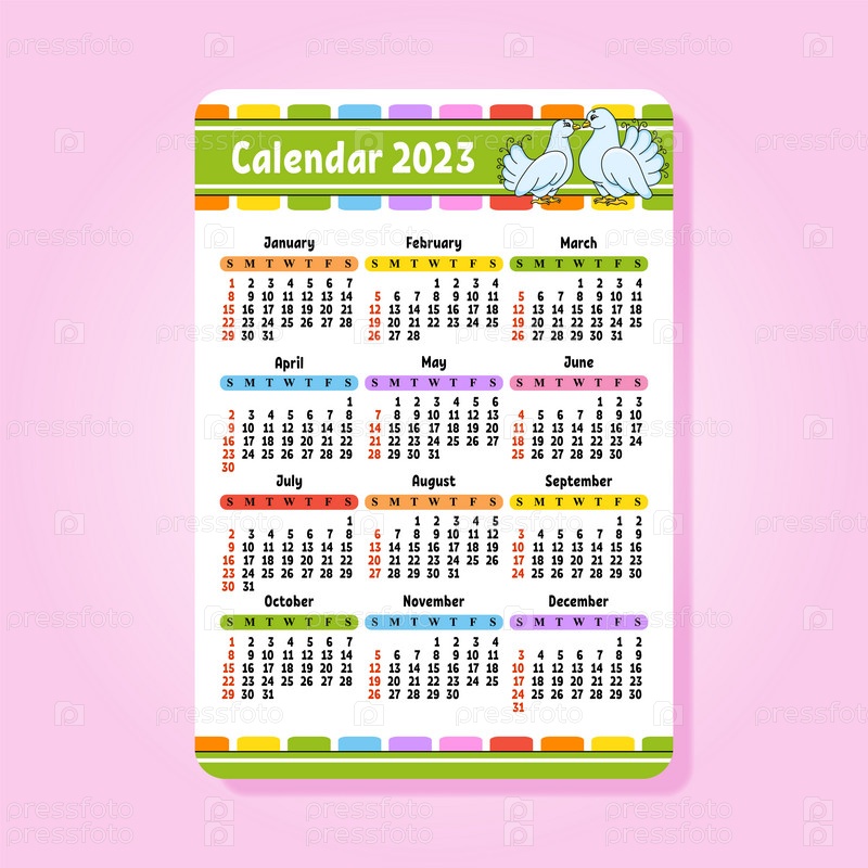 Календарь на 2023 год с милым персонажем. Веселый и яркий дизайн. Карманный размер. Мультяшный стиль. Векторная иллюстрация