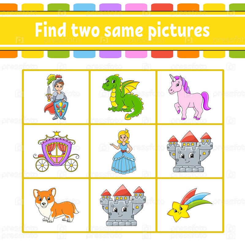 Найдите две одинаковые картинки. Задание для детей. Образовательный развивающий рабочий лист. Страница с заданиями. Цветная игра для детей. Забавный персонаж. Мультяшный стиль. Векторная иллюстрация