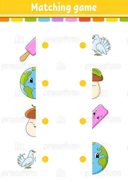 Игра на соответствие. Нарисуй линию. Образовательный развивающий рабочий лист. Страница с заданиями с цветными картинками. Загадка для детей. Милый персонаж. Мультяшный стиль. Векторная иллюстрация