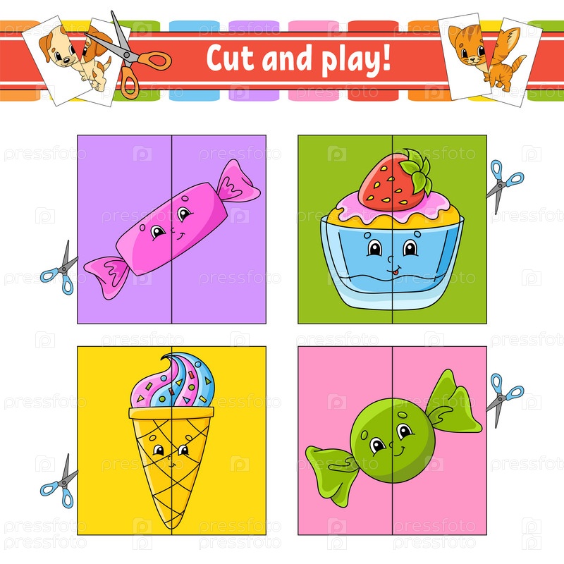 Разрезай и играй. Флэш-карты. Цветной пазл. Образовательный развивающий рабочий лист. Тема дня рождения. Страница активности. Игра для детей. Забавный персонаж. Изолированная векторная иллюстрация. Мультяшный стиль