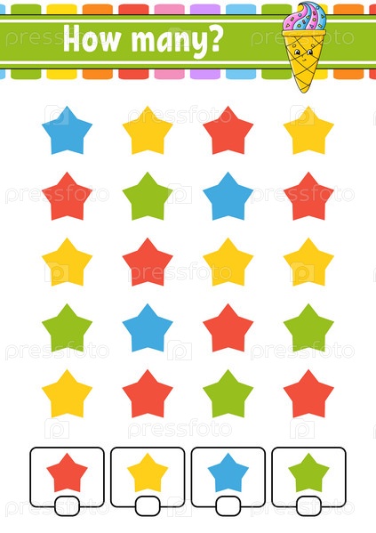Игра-подсчет для детей. Счастливые персонажи. Изучение математики. Сколько объектов на картинке. Рабочий лист по образованию. С местом для ответов. Изолированная векторная иллюстрация в милом мультяшном стиле