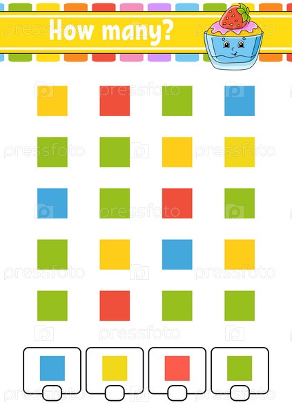 Игра-подсчет для детей. Счастливые персонажи. Изучение математики. Сколько объектов на картинке. Рабочий лист по образованию. С местом для ответов. Изолированная векторная иллюстрация в милом мультяшном стиле