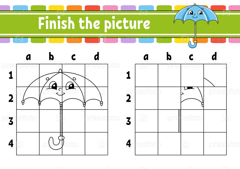 Дорисуй картинку. Страницы раскраски для детей. Развивающий рабочий лист. Игра для детей. Практика письма. Персонаж мультфильма. Векторная иллюстрация