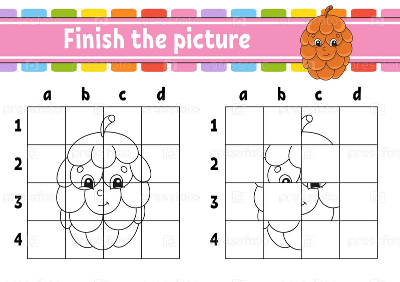 Дорисуй картинку. Страницы раскраски для детей. Развивающий рабочий лист. Игра для детей. Практика письма. Персонаж мультфильма. Векторная иллюстрация